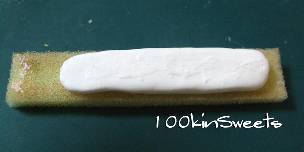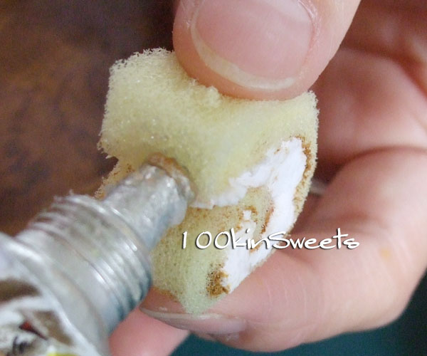 4. スポンジにボンドをつけ、クリームをくっつけます。