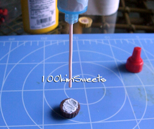 軽量粘土を栗の色に着色して、丸めて、乾燥したら、モンブランに乗せて、エポキシをかける。