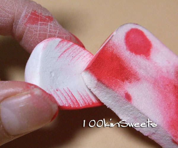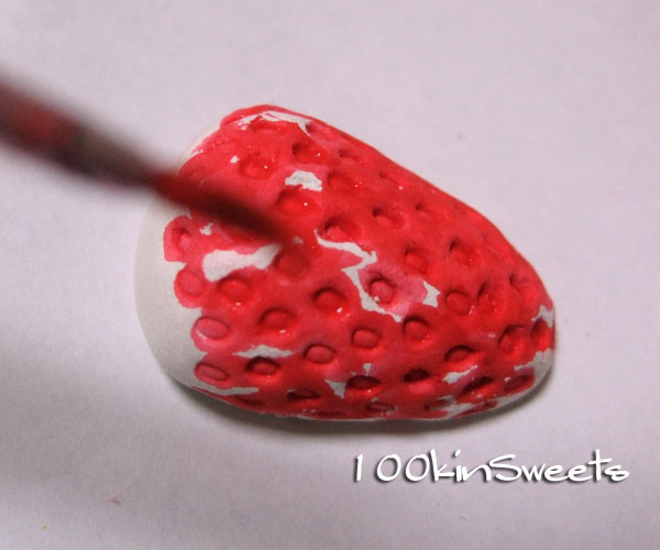 2. スポンジで苺の表面全体に色を塗ります。