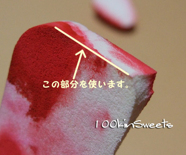 このスポンジの角を斜めして苺に触れていきます。