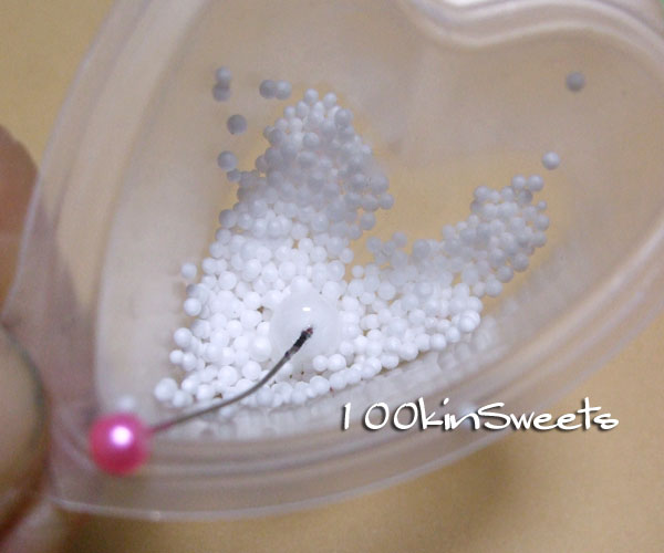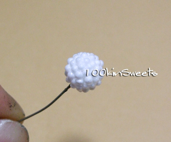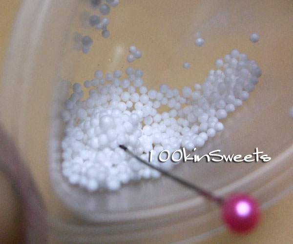 1. ビックサイズラズベリーで使ったしっかり発砲ビーズを針に刺します。