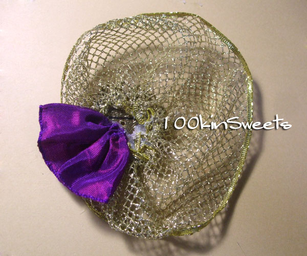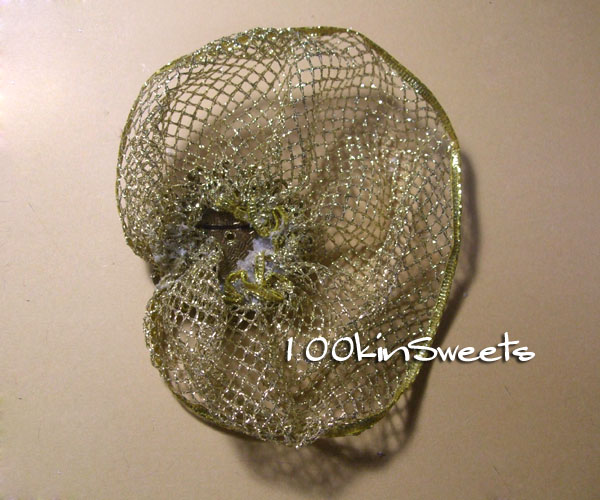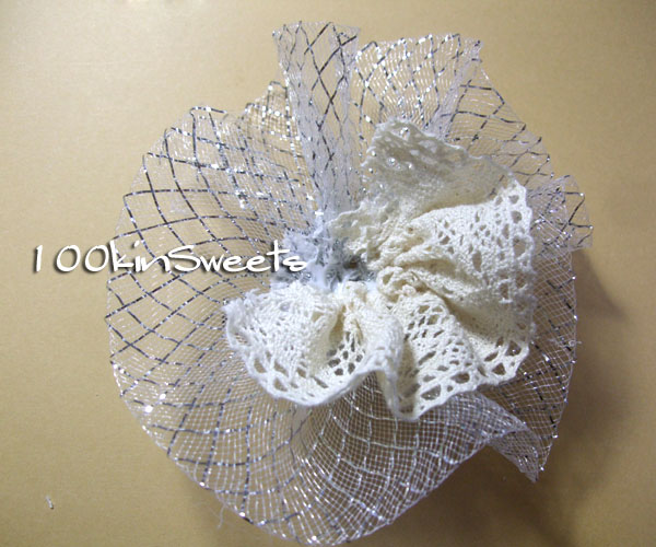 次に、土台に、くしゅくしゅっと縮めたリボンをグルーで貼ります。