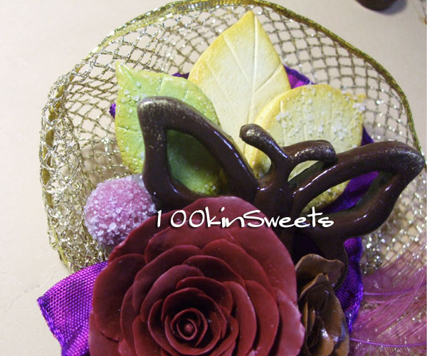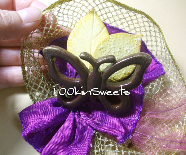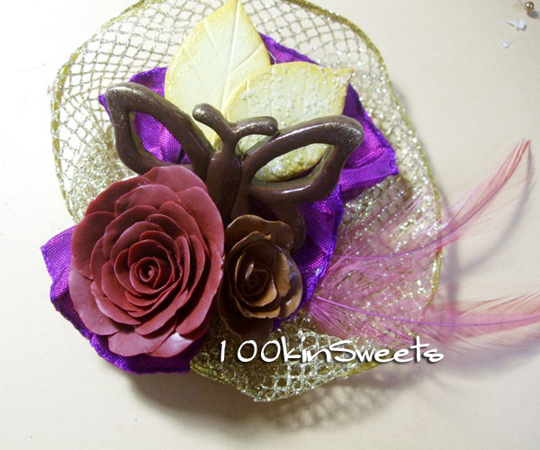 そしたら、蝶のチョコの前に、バラの花を貼ります。