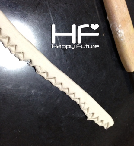 1)平たく細く伸ばした石粉粘土にギザギザの切り込みを入れる。