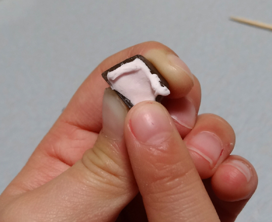 チョコアイスのハーフカットタイプに茶色に着色したエポキシ系接着剤や茶色のグルーを入れて、ハーフカットタイプのチョコアイスを作りましょう。