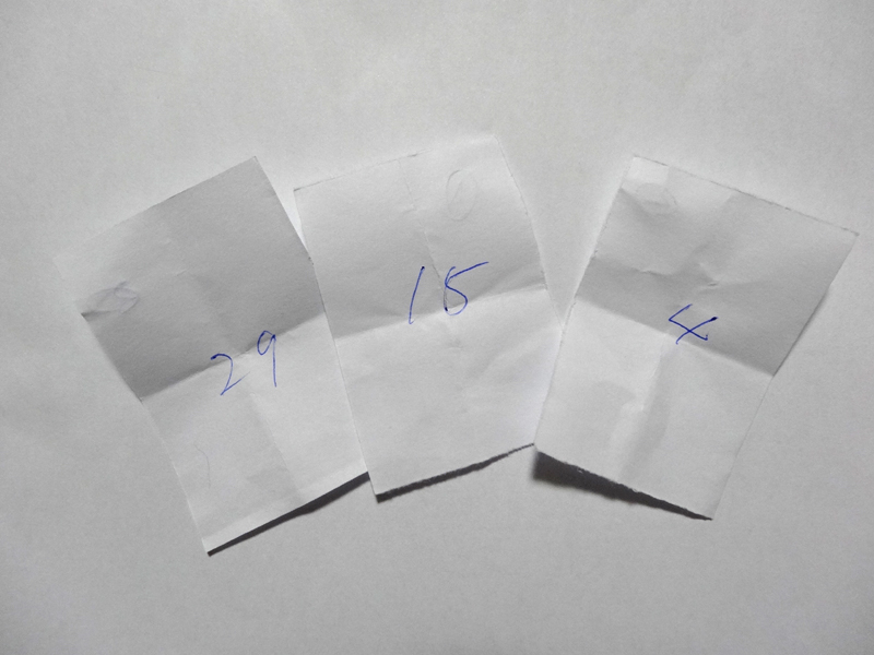 その数と同じだけの番号を書いた紙を器に入れ、息子に選んでもらいました。