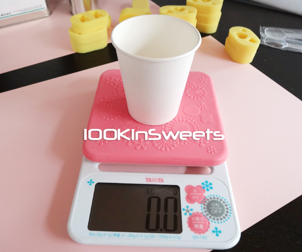 例えば、デジタルスケールに紙コップを乗せて、0設定にした後、主剤を4gいれる。