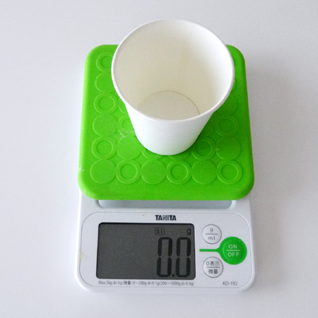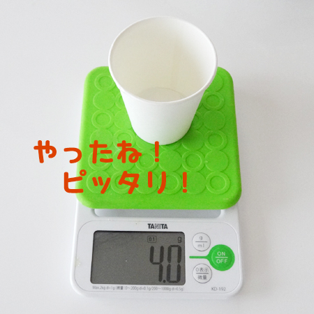 1.デジタルスケールに紙コップを載せて、0表示ボタンを押す。