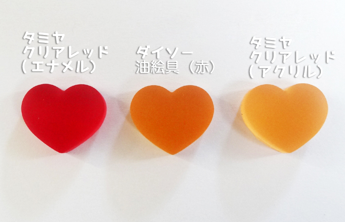 クリアレッド(エナメル)以外で何かオススメはありますか?ということであればダイソーさんの油絵具(紅)かな。