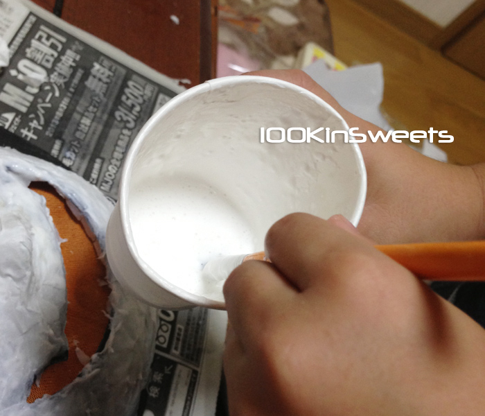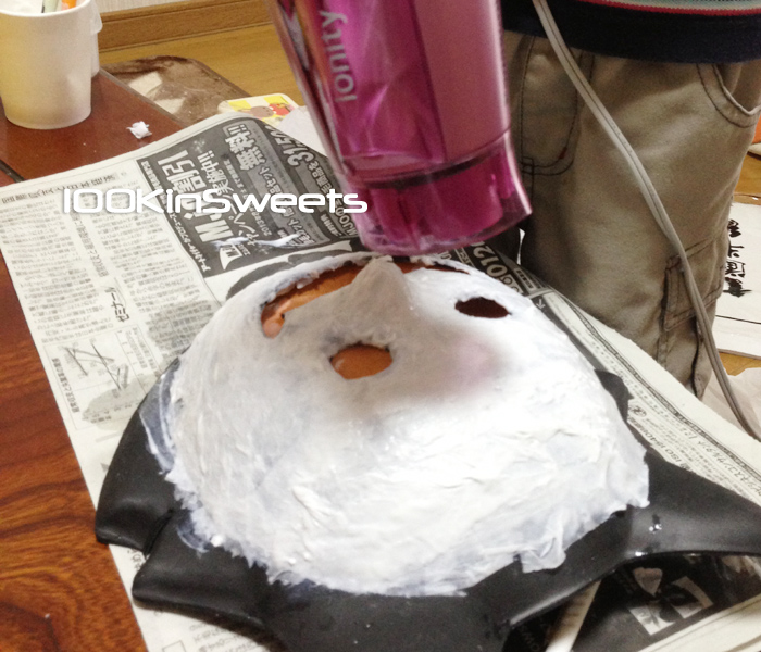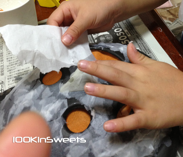 後でお面からはがすことを考えて一層目は水でお面にくっつけていきました。