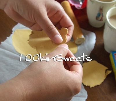 2. 薄く伸ばした粘土をちぎります。
